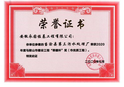 热烈庆祝安徽永固桩基工程有限公司参建的当涂县第三污水处理厂荣获2020年度马鞍山市建设工程“翠螺杯”奖(市优质工程)