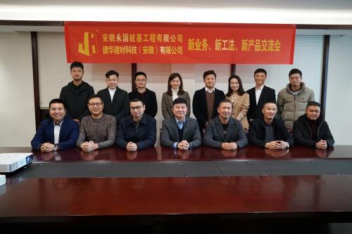 2020年12月9日下午,安徽永固桩基工程有限公司(以下简称安徽永固桩基)与建华建材科技(安徽)有限公司(以下简称建华安徽科技)新业务、新工法、新产品交流会在公司办公楼会议室召开。