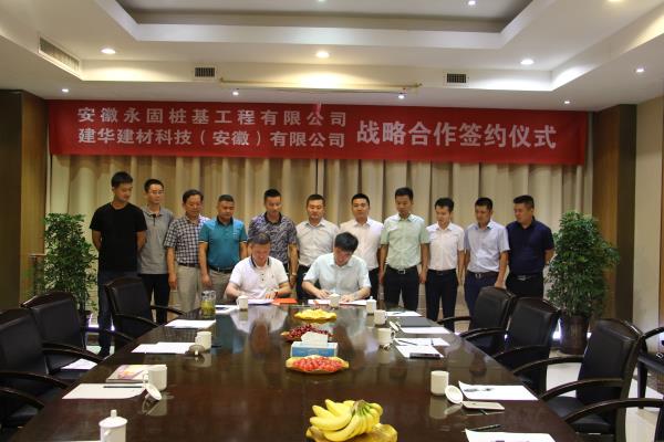 2019年6月20日,建华建材科技(安徽)有限公司代表团一行7人莅临安徽永固桩基工程有限公司,双方签署了《战略合作协议》。
